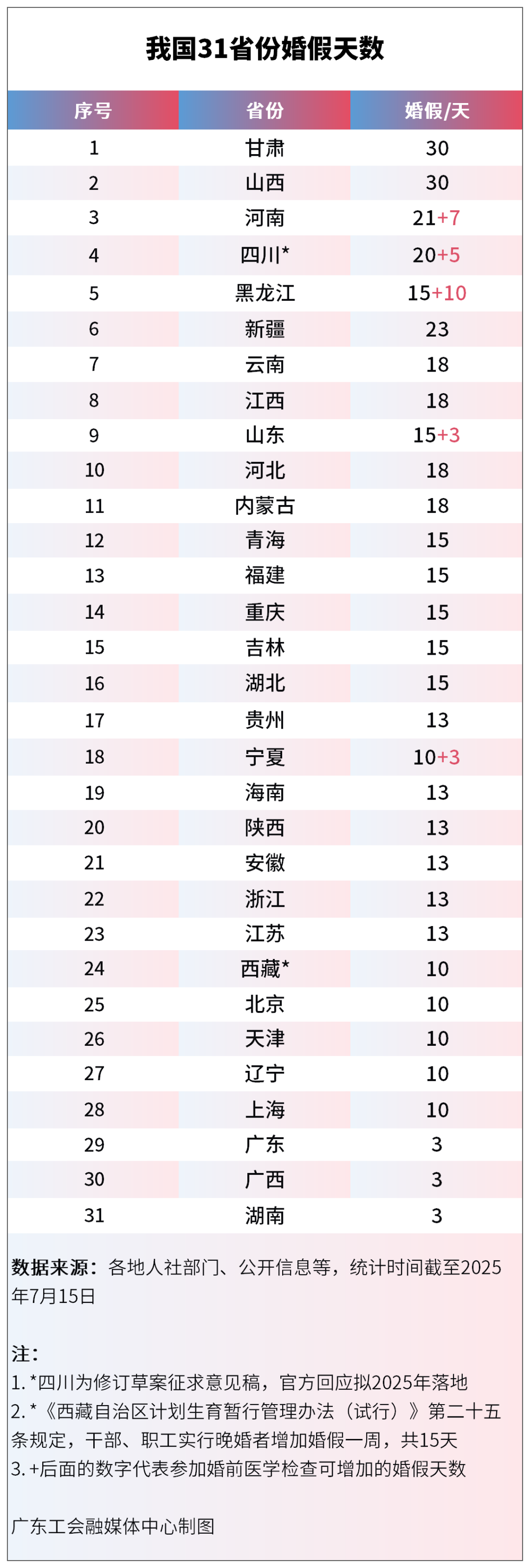具体来看,甘肃、山西婚假达30天,是全国婚假最长的省份。