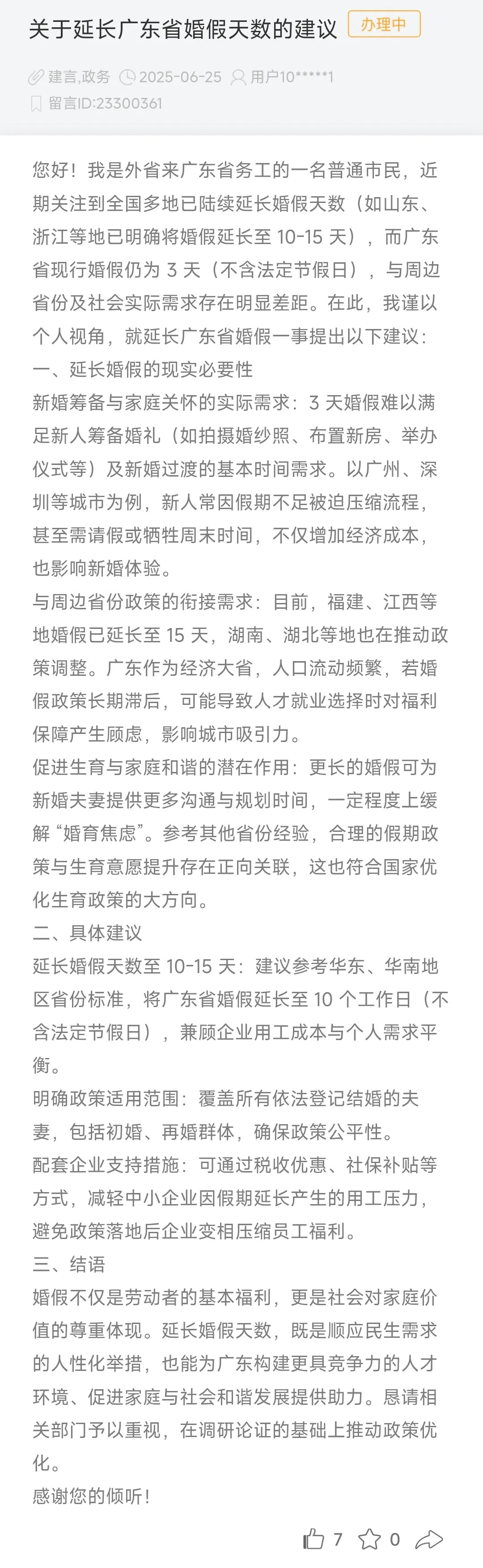 近日,有网友在人民网领导留言板上发帖建议广东延长婚假至10-15天,并给出理由:3天婚假无法满足新人筹备婚礼及过渡需求;更长婚假可缓解“婚育焦虑”,与生育意愿提升正相关,符合国家政策方向;同时可配套税收优惠、社保补贴等减轻中小企业用工压力。