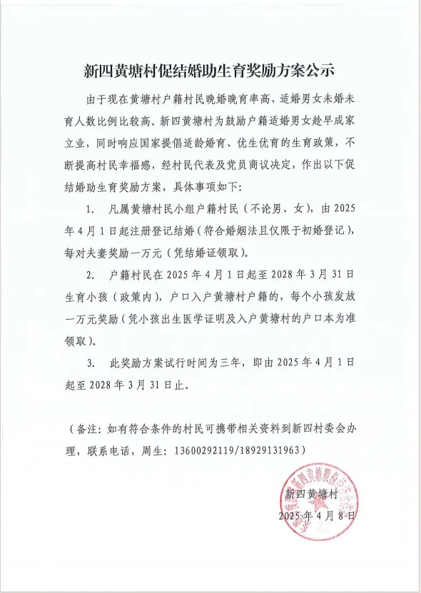 ● 今年5月,广东省东莞市横沥镇新四黄塘村公布婚育奖励方案,符合婚姻法且仅限于初婚登记,可获一万元奖励。