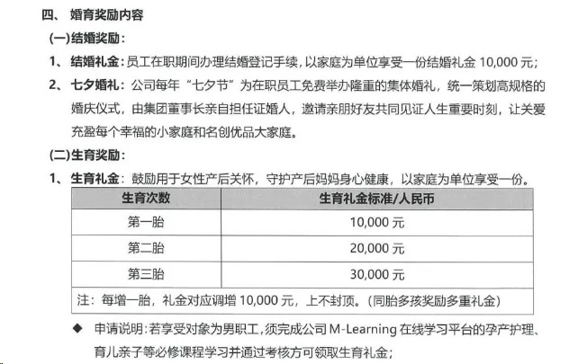 ● 2024年3月,广东企业名创优品发布《婚育奖励方案》员工在职期间办理结婚登记可获1万元礼金奖励。