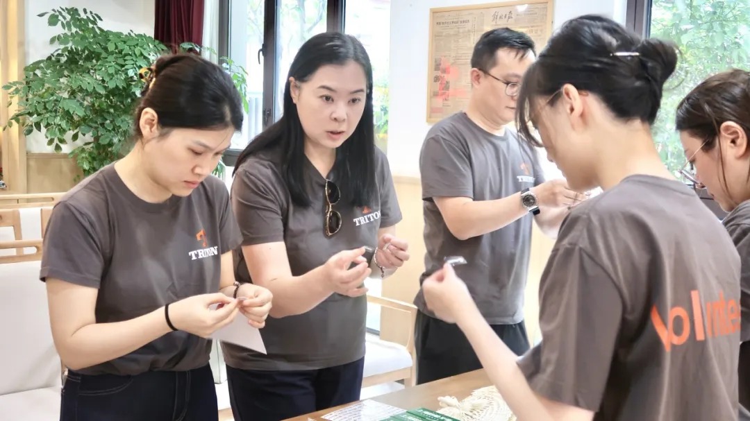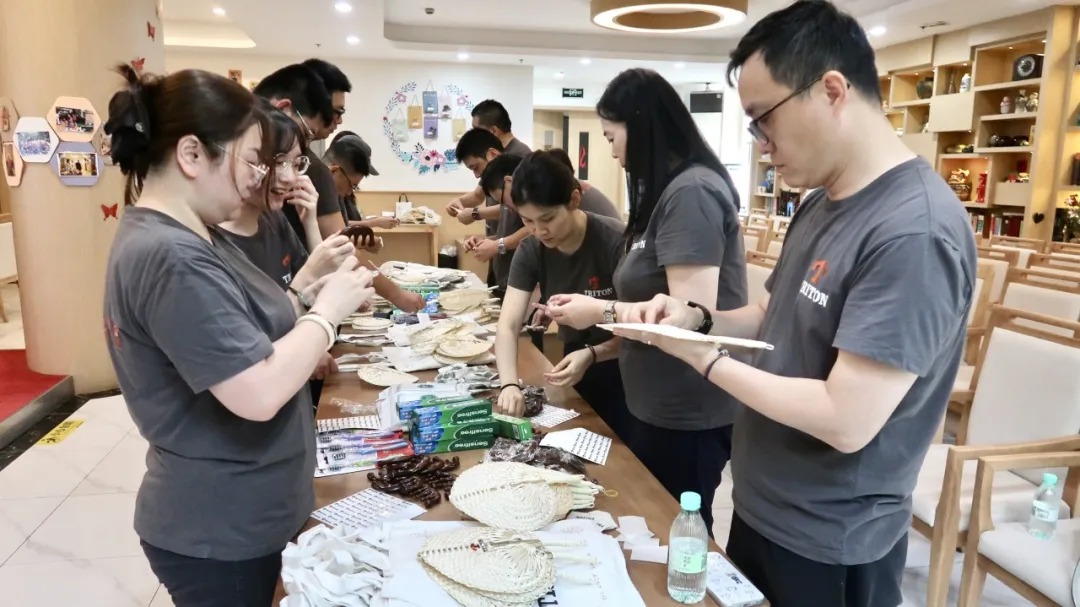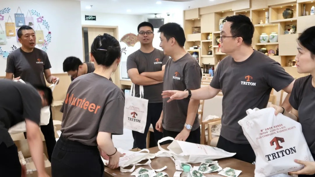 贴标组志愿者将印有TRITON logo的贴纸细心粘贴在清凉物品显眼位置,彰显企业对活动的重视;分装组则按预设组合,将物品整齐装入定制帆布袋,每一份礼包都承载着对老人的诚挚关怀。