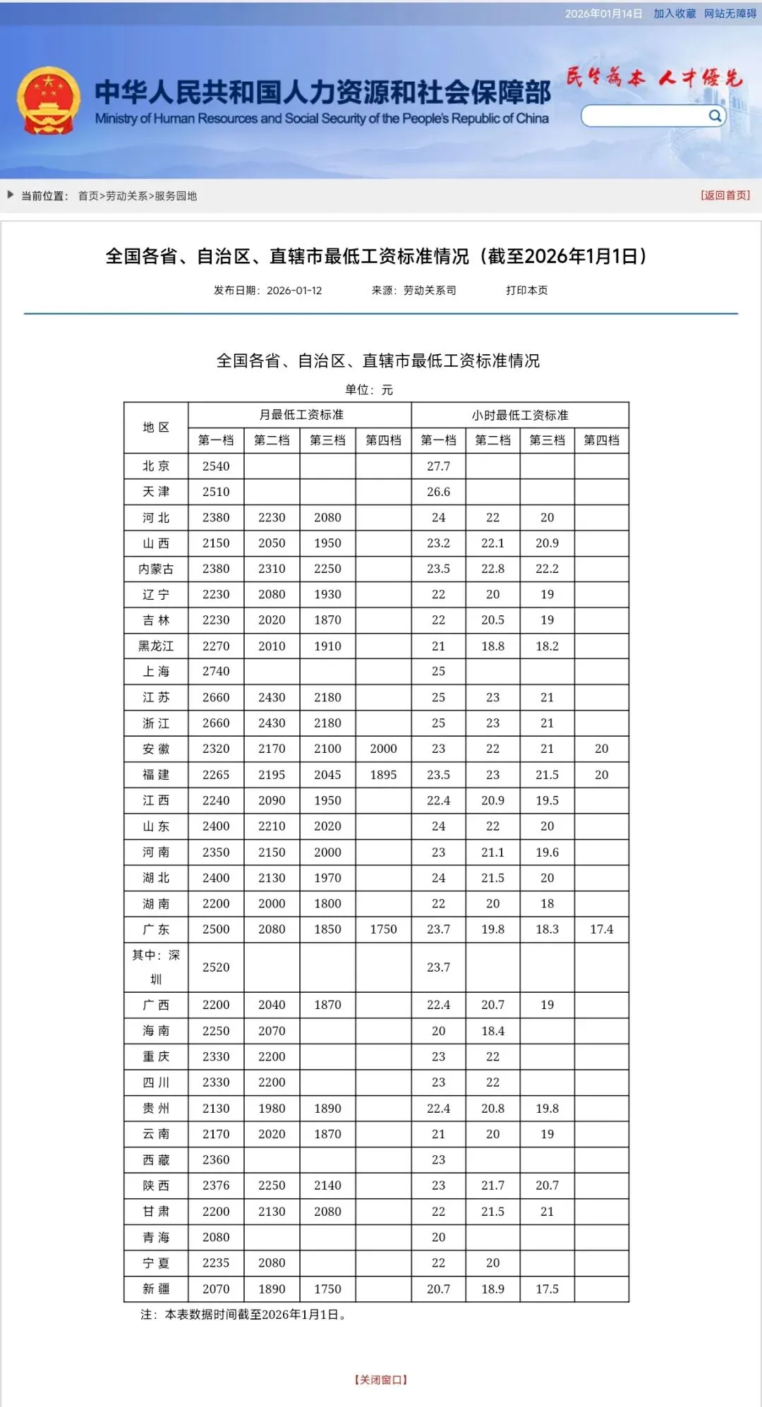 1月12日,人社部官网公布全国各省、自治区、直辖市最低工资标准情况