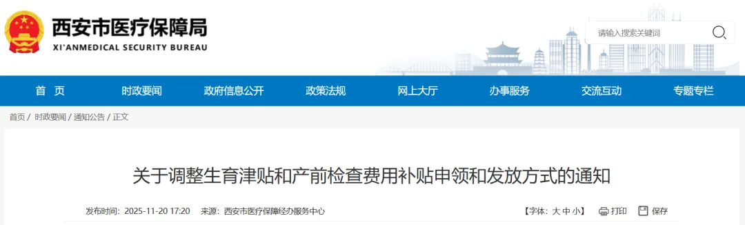 11月20日,西安市医疗保障局网站发布关于调整生育津贴和产前检查费用补贴申领和发放方式的通知。具体内容如下: